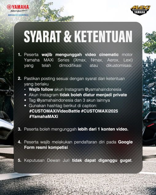 Kompetisi berlangsung mulai 1 – 30 September 2025 dengan total hadiah senilai Rp 8.500.000 untuk para pemenang. Peserta diwajibkan mengunggah video cinematic motor MAXI Yamaha yang telah dimodifikasi atau dikustomisasi ke akun Instagram pribadi masing-masing. Postingan harus sesuai syarat dan ketentuan, yakni wajib follow akun Instagram resmi @yamahaindonesia, akun tidak boleh diatur private, men-tag @yamahaindonesia dan 3 akun lainnya, serta menggunakan hashtag #CUSTOMAXIVideoBattle #CUSTOMAXI2025 #YamahaMAXI. Peserta juga diperbolehkan mengunggah lebih dari 1 konten video, serta wajib melakukan pendaftaran melalui Google Form resmi kompetisi.