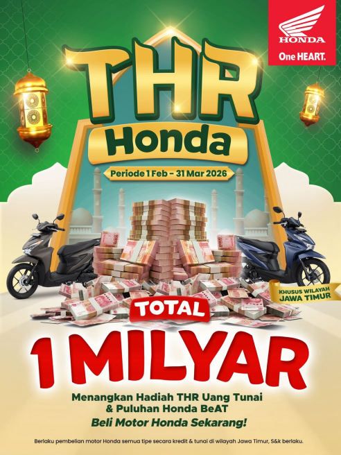 Program undian THR Honda 2026 berlangsung selama periode 1 Februari hingga 31 Maret 2026, dengan proses pengundian yang akan dilaksanakan pada April 2026. Masyarakat yang melakukan pembelian sepeda motor Honda di jaringan dealer resmi Honda wilayah Jawa Timur berkesempatan meraih hadiah THR berupa uang tunai serta puluhan unit sepeda motor Honda BeAT.